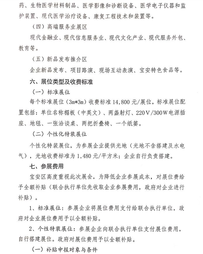 二、展费补贴:在宝安区注册的企业全额补贴展位费(先交后补)。