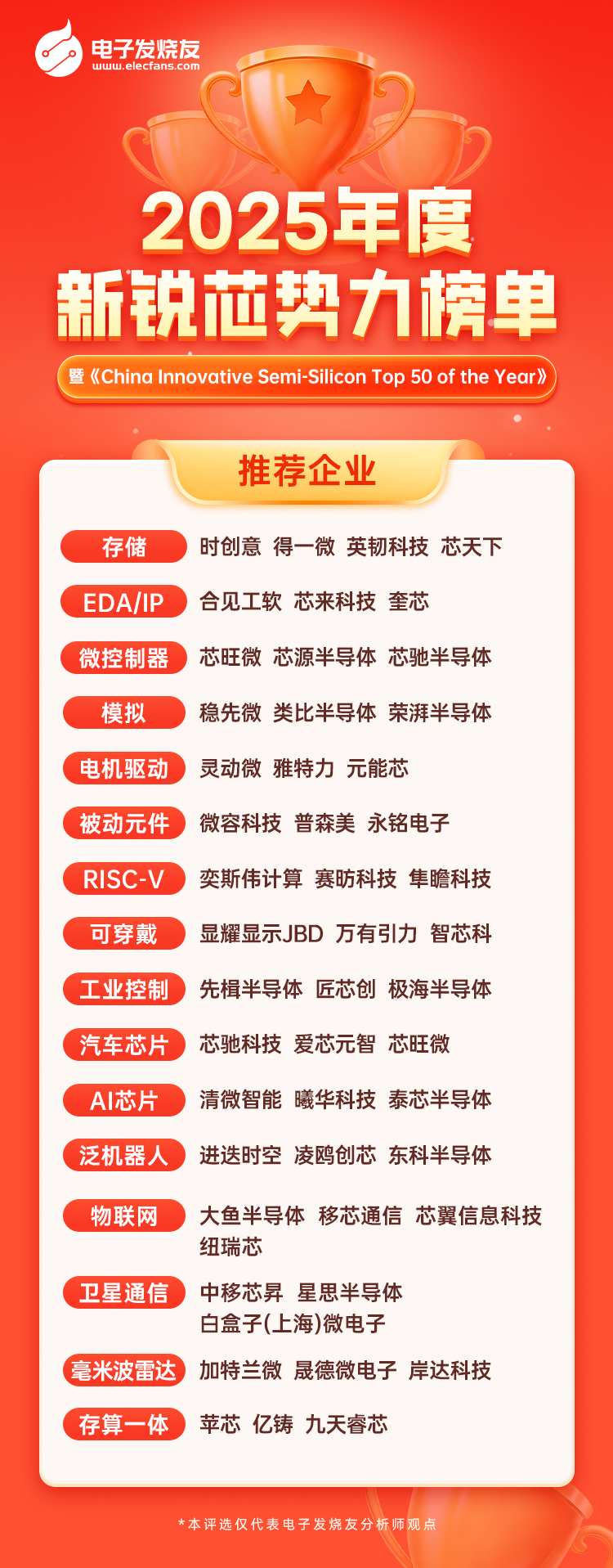 本次榜单由电子发烧友分析师团队专业打造,深入存储、EDA/IP、可穿戴、AI 芯片等 16 个半导体细分赛道,聚焦非上市芯片产业链企业,从技术突破、市场潜力、生态构建等多维度综合评估,推选出各领域极具代表性的新锐力量。2025 年,全球半导体产业迎来规模与质量双升的高质量发展新阶段,AI 算力需求爆发、车芯联动深化、AR/VR 等新兴场景拓展,为国产芯片企业带来了前所未有的战略机遇。智芯科此次入选,正是其深耕可穿戴核心技术、打造自主创新产品、抢占高端赛道的实力印证。